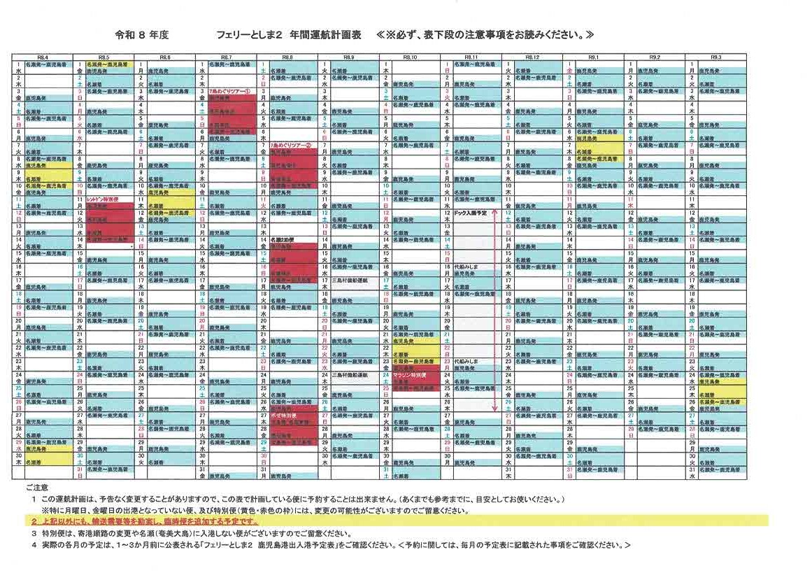 令和8年度 フェリーとしま2 年間運航計画表